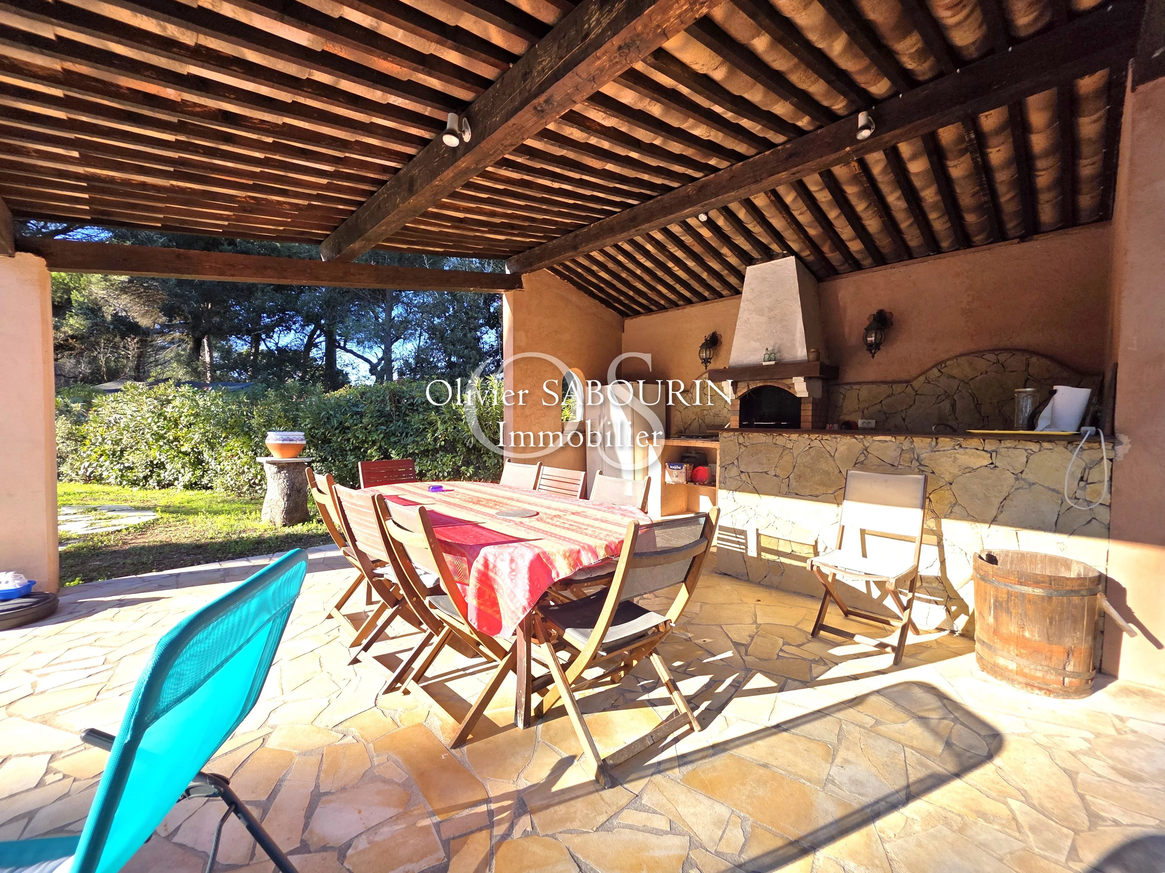 Cheminée à foyer fermé, traversante, avec accès à 2 terrasses, dont une avec coin barbecue.