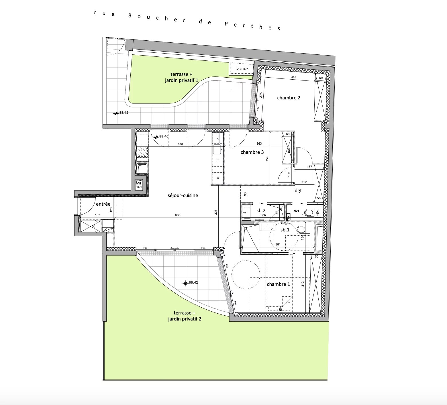 Il se compose d’une entrée ouvrant sur un séjour spacieux et lumineux avec un coin cuisine, de trois chambres équipées de dressings, d’une grande salle de bain, d’une salle d’eau et de WC séparés.