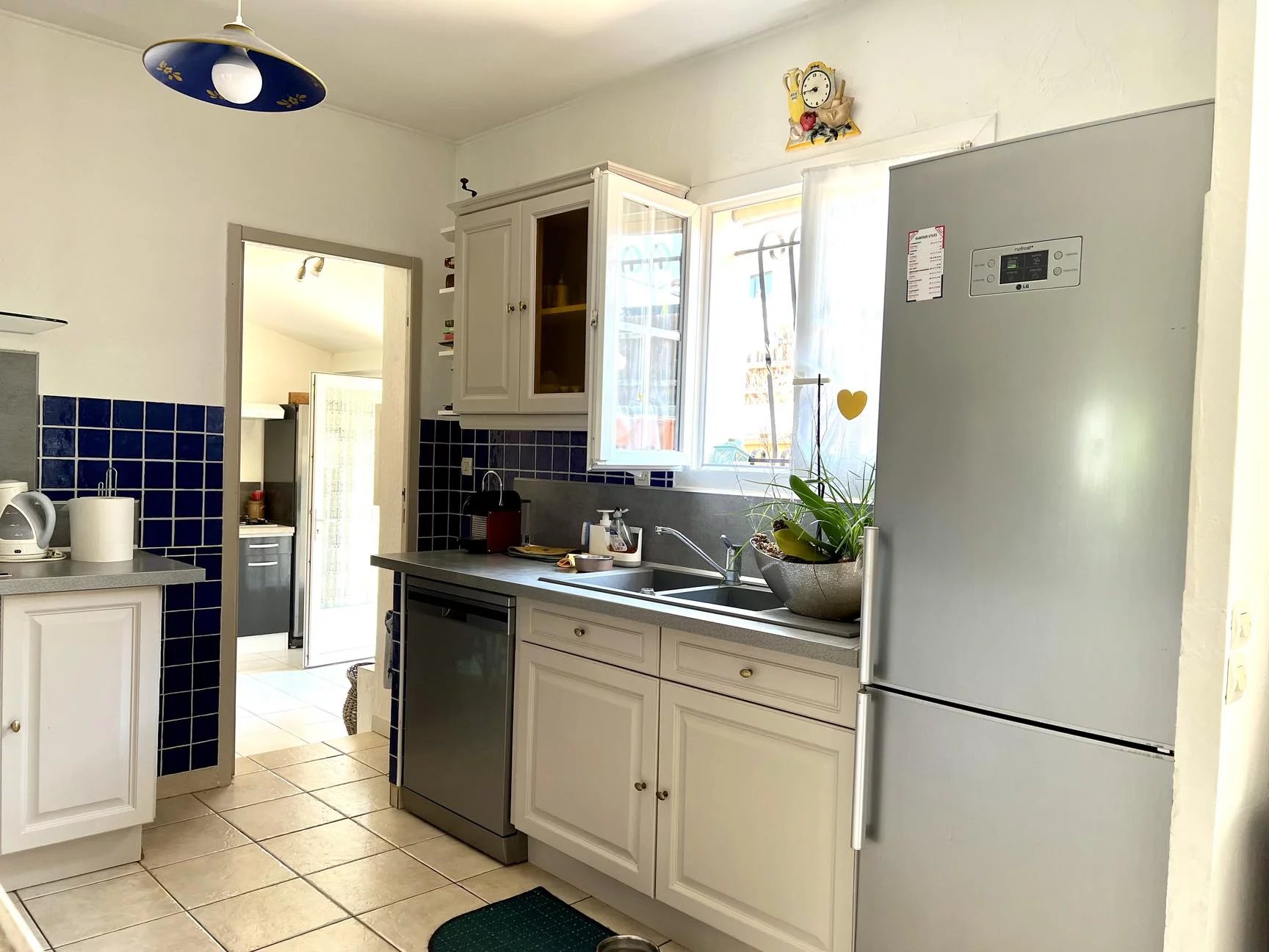 La cuisine est équipée d’un cellier attenant au garage de 20 m² aménagé avec sa mezzanine. Côté nuit, 3 chambres, dont deux avec placards, une salle de bain avec douche et baignoire avec placard et un WC. À ce bien, s’ajoute au nord un potager, un abri bois, un petit atelier, et le barbecue. Toutes les fenêtres sont en double vitrage et sont équipées de moustiquaires.