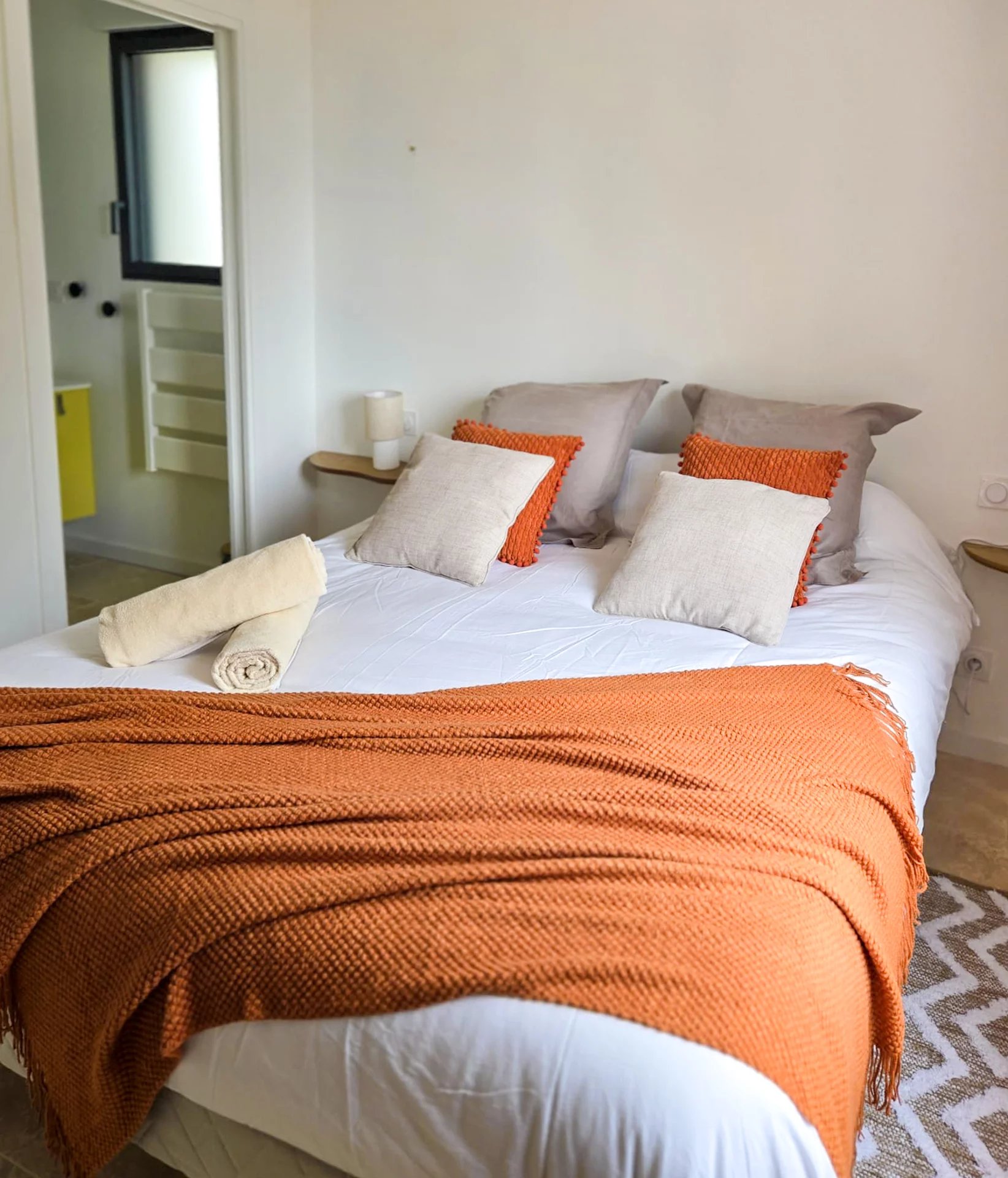 Rez-de-chaussée : 2 suites parentales climatisées (salle de bains privative), salon cosy vue mer (TV, WiFi, clim), cuisine ouverte équipée et aménagée, WC séparé.