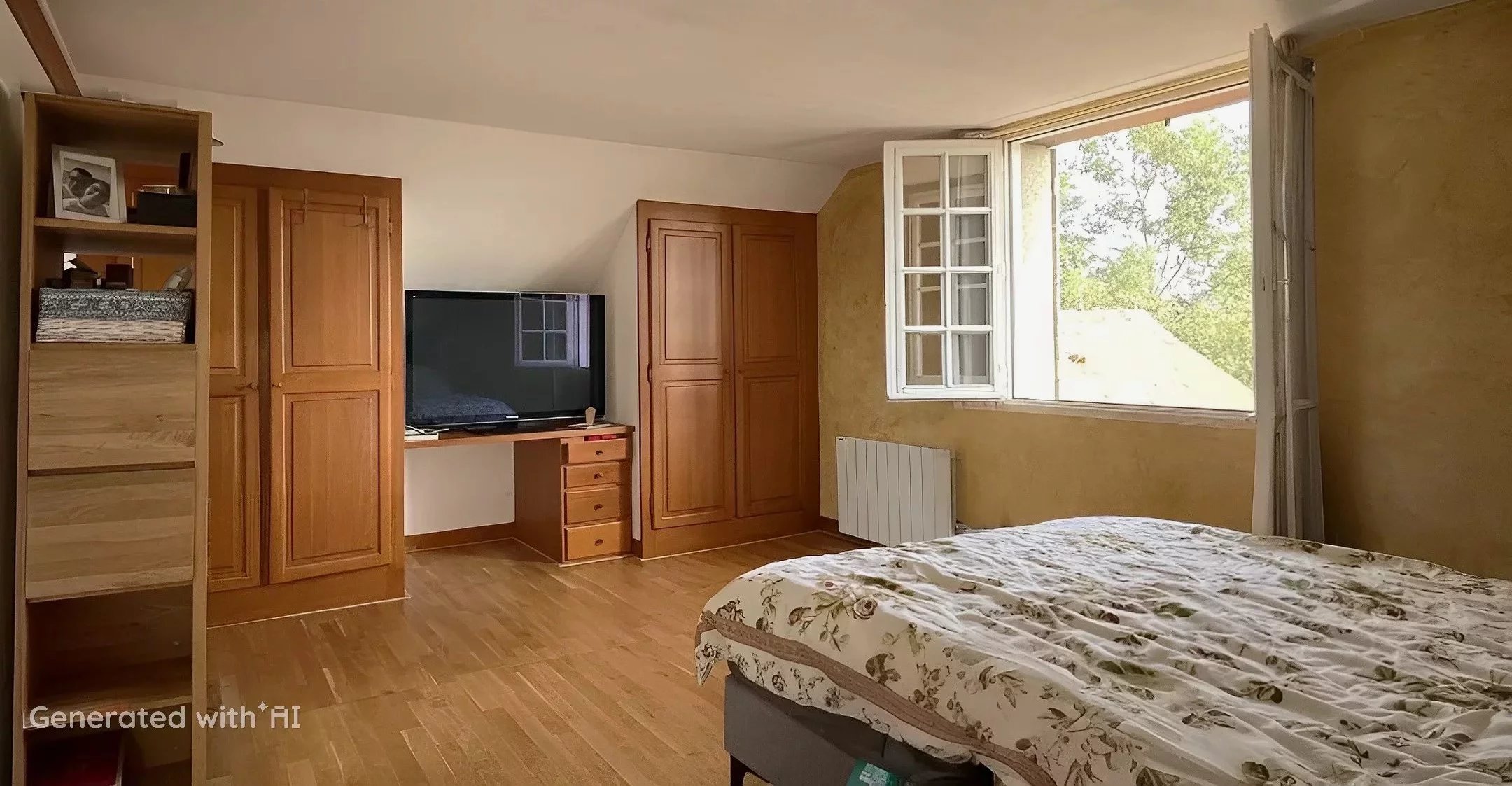 Elle offre une belle pièce de vie d’environ 50 m², mettant en valeur tomettes, poutres et cheminée, créant une atmosphère chaleureuse et authentique.