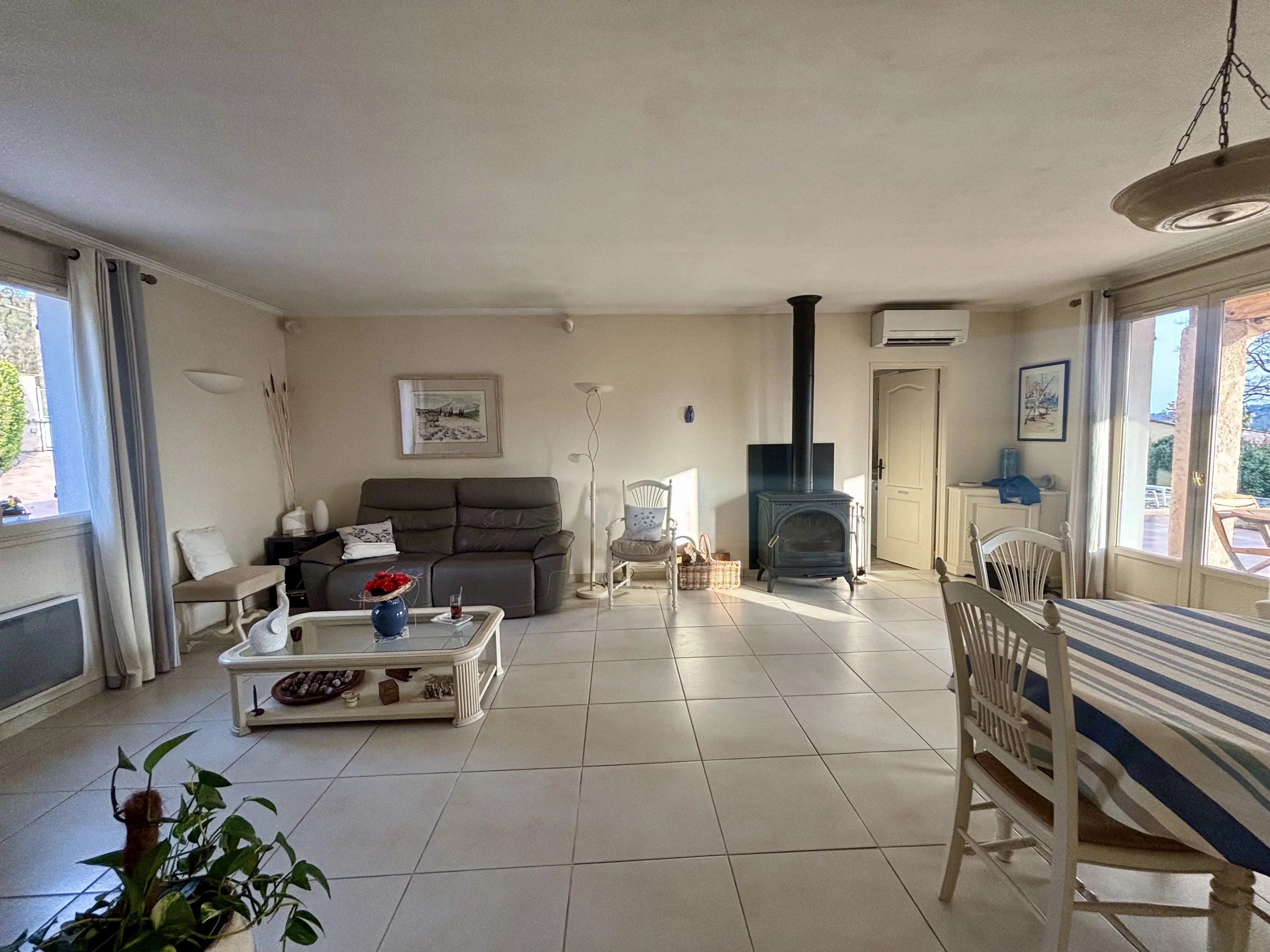De plain-pied, la maison offre un confort optimal avec double vitrage, climatisation réversible, poêle à bois et panneaux photovoltaïques.